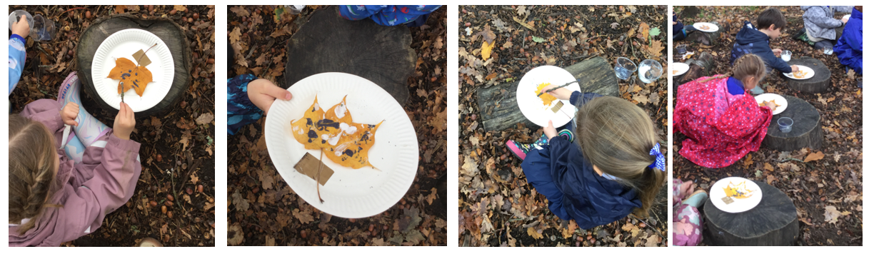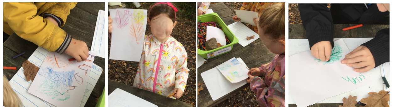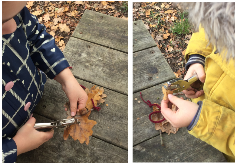 As an optional activity, Mrs. Dear supplied crayons for the children to create leaf rubbings. She also provided tree identification guides to assist them in recognising the types of leaves used. Furthermore, hole punches were made available, so the children could punch autumn leaves and thread them onto wool—a great task for developing fine motor skills.