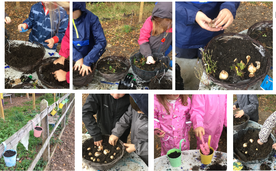 Mrs Dear had also bought tete-tete narcissi bulbs and grape hyacinth bulbs for the children to plant in the hanging baskets and pots. The children who chose to do this discussed the difference between bulbs and seeds, and shared this understanding with the rest of the class at the end of the sessions. This supports their scientific learning about plants and plant lifecycles.
