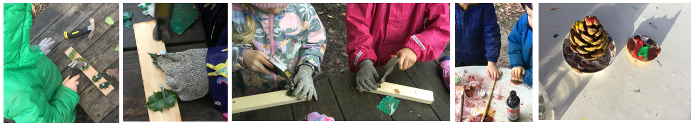 The children learnt to use hammers safely and practise a pincer grip with nails, even though the holly leaves were tricky. Others painted wooden discs as robins.