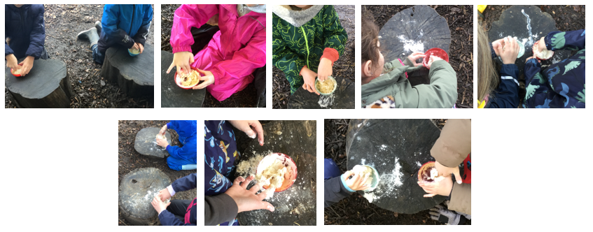 The children were then given the ingredients to make campfire bread. Each child had a pot of flour with a tiny pinch of salt, and once a splash of water was added, they gently combined it to create a simple dough. There was plenty of trial and error to find the right consistency, and the challenge was to avoid getting sticky hands!