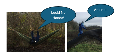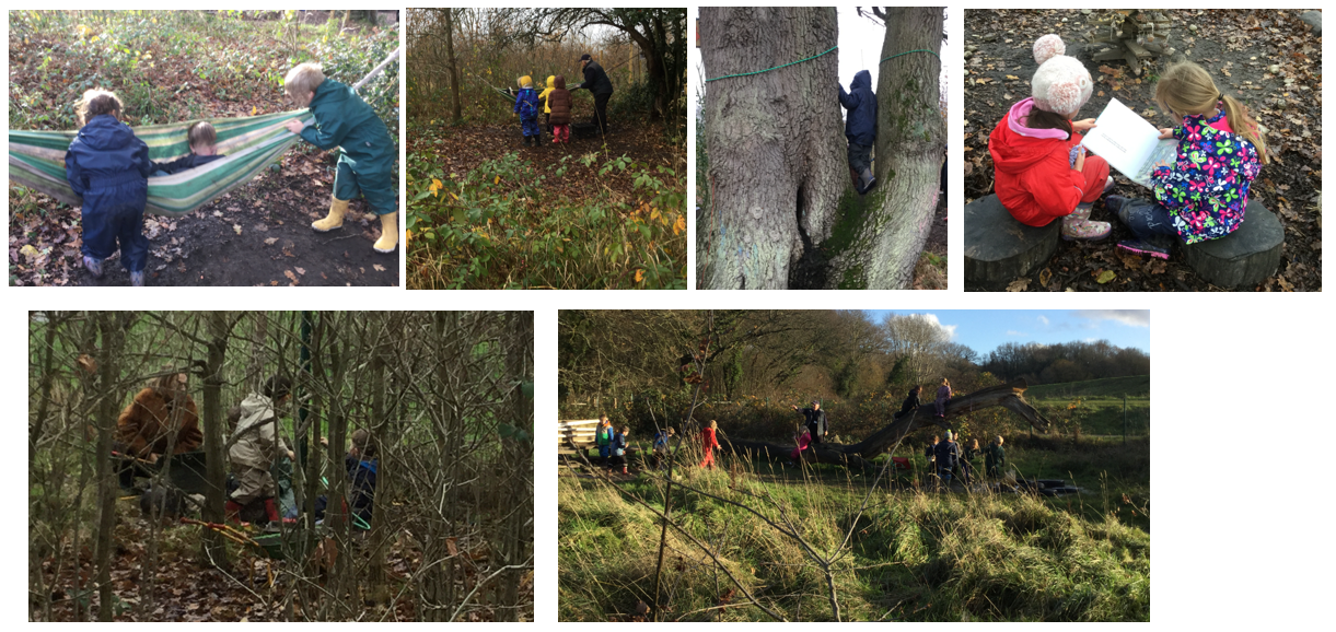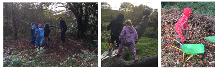 Whilst the children were freely playing and exploring, the majority of children were enjoying the opportunities available for developing gross motor skills. The hammock was enjoyed; climbing the big log tackled, and exploring balance by playing on a plank like a seesaw.