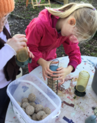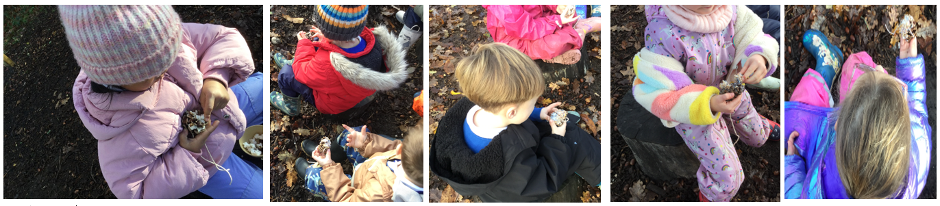 The children each created a pinecone bird feeder by pressing a mixture of lard, bird seed, and raisins into the spaces of their pinecones. This activity offered a sensory experience because the mixture felt squishy and oily. As they worked, Mrs Dear explained the importance of feeding birds during winter and how the lard helps provide essential fat to keep the birds warm.