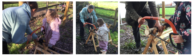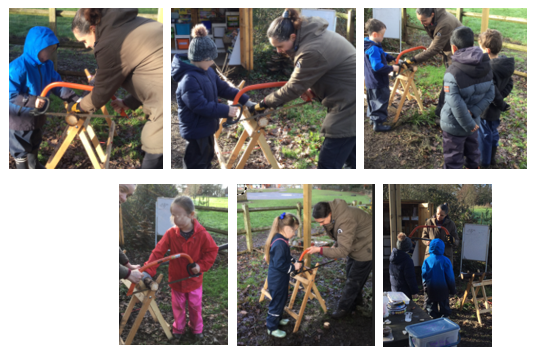 Mrs Dear taught children how to safely use the bow saw to cut a wooden disc. As part of their tool talk, the children learnt to identify the handle, body, sheath, and blade before being guided through the correct motion needed to saw the branch smoothly.