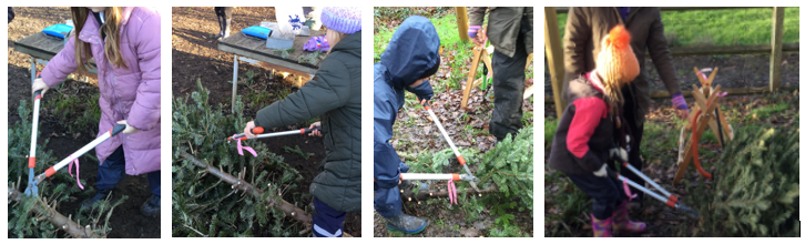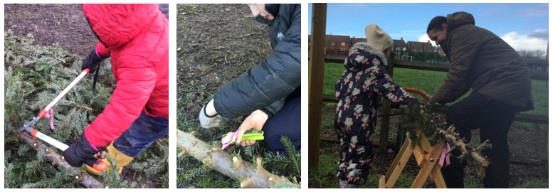 As part of an optional adult-led activity, Mrs Dear introduced the children to a new gardening too – loopers. With guidance, they were able to safely cut branches from the trunks of donated Christmas trees.