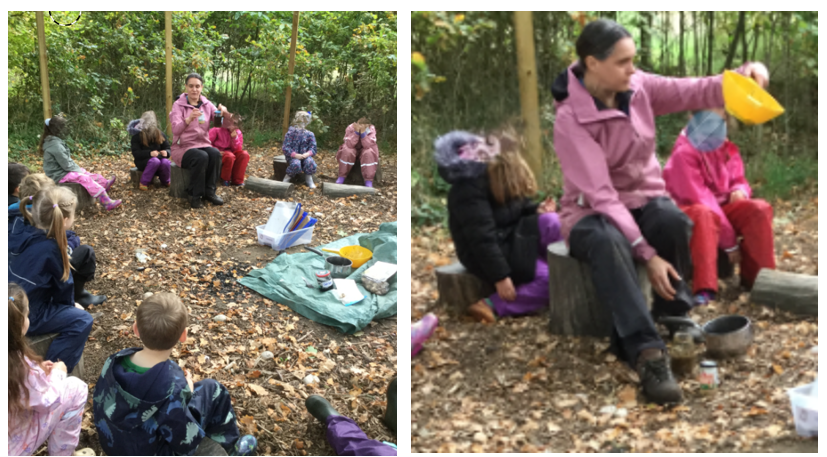 Once the fire was lit, Mrs Dear got busy preparing blackberry crumble. The children observed how the blackberries and oats changed when they were heated over the fire - and the change of state of the butter from solid to liquid. Some children noticed that the blackberries started to bubble, and Mrs Dear explained about the boiling point of liquids.