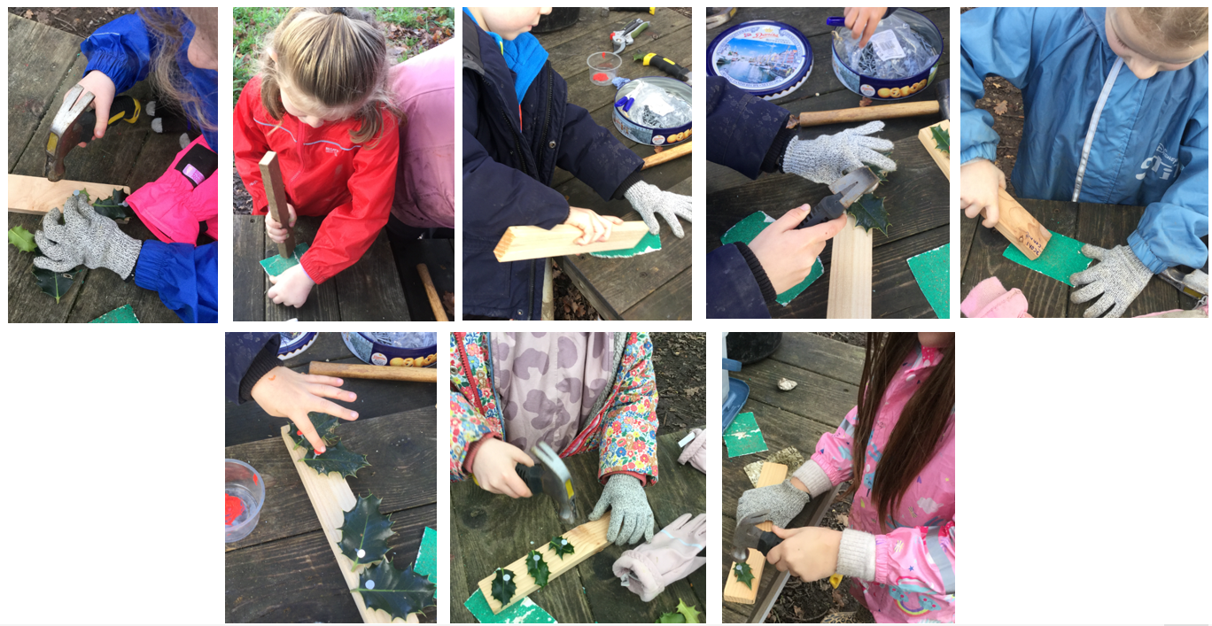 As an extension of their toolwork, Mrs Dear introduced the use of stumpy hammers, discussing how these differed from the mallets used in the previous weeks. The children practised securing holly leaves to wooden batons using nails, first preparing the wood with sandpaper to smooth any rough edges.