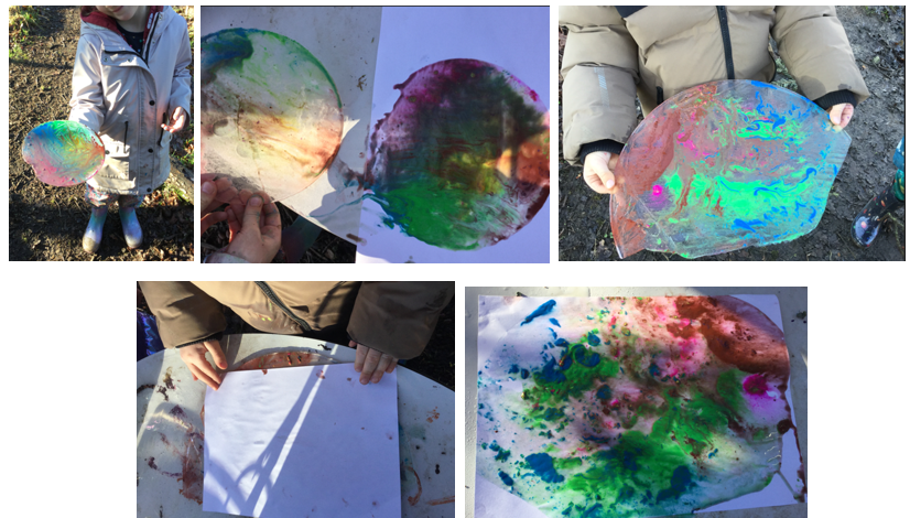On Wednesday, the children were fascinated by the patches of ice around the site. One child painted onto a large piece of ice, prompting a conversation with Mrs Dear about melting and how her artwork wouldn’t last. To preserve it, they worked together to create a print by pressing paper gently onto the ice. Inspired, another child chose to try the same technique.
