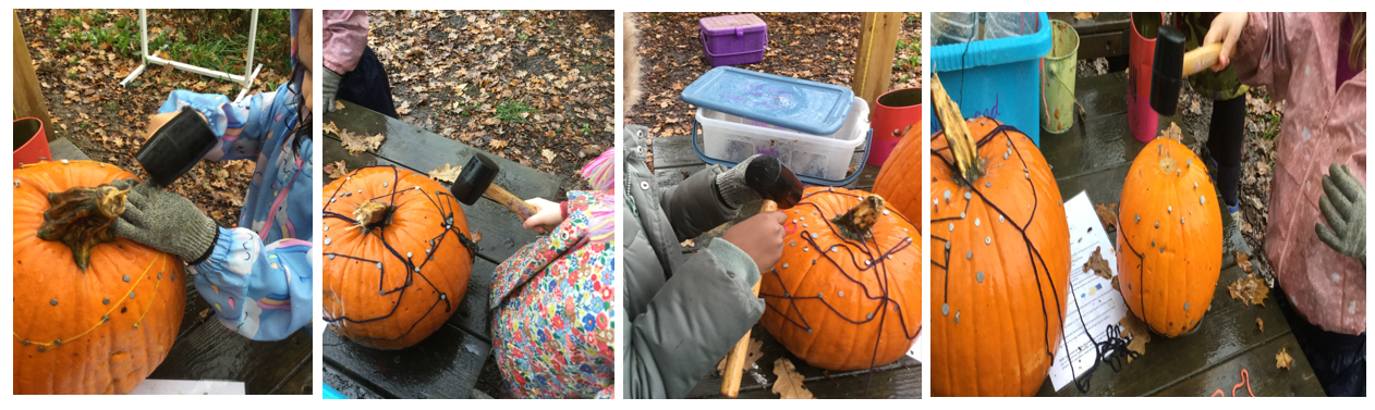 Some children continued to practise their mallet skills, by banging nails into pumpkins. By having the same activities available over a few weeks, allows more children to try the activity if they wish, and other children to revisit and develop their skills.