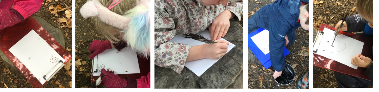Year Two enjoyed excellent autumn weather during their Beyond the Gate sessions this week. Each session began with the children bringing their oak gall mixtures to make ink. Two weeks ago, they had crushed Knobber Galls with water in one jar and placed a rusty nail in vinegar in another. Over the two weeks, they have regularly shaken the jars in their classrooms.