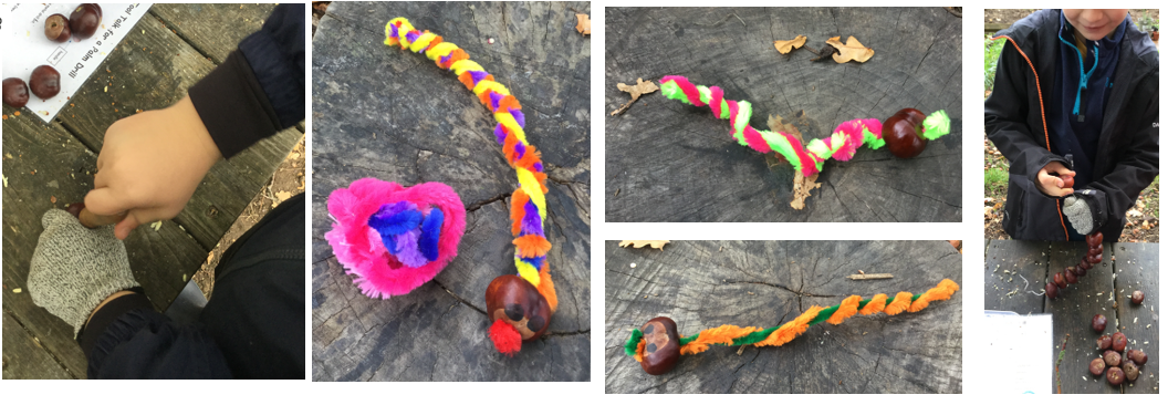 Other children continued to work creatively with the palm drills and conkers. In one class, the children worked out how to use pipe cleaners to create snakes with conker heads.