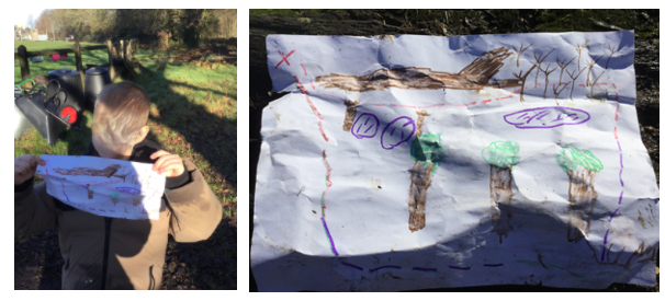 Another child followed his interest—possibly inspired by the class’s current pirate topic—and created his very own treasure map. He spent considerable time drawing it with great detail and then proudly led both adults and children on guided explorations around the site. His map‑reading and understanding of the Beyond the Gate landscape were incredibly impressive, with features such as the big log, maze, and 3 large oak trees drawn and positioned correctly.