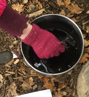Year Two enjoyed excellent autumn weather during their Beyond the Gate sessions this week. Each session began with the children bringing their oak gall mixtures to make ink. Two weeks ago, they had crushed Knobber Galls with water in one jar and placed a rusty nail in vinegar in another. Over the two weeks, they have regularly shaken the jars in their classrooms.