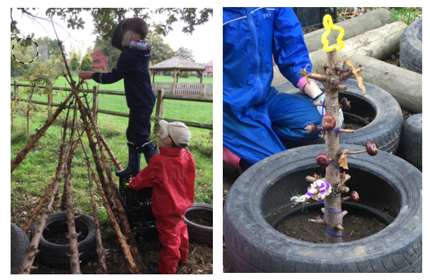 The children spent their time playing freely and exploring, taking advantage of the loose part equipment. Our site has changed considerably since their last visit in Year R back in May; autumn rain has brought mud and puddles, while fallen leaves offering a different sensory experience.