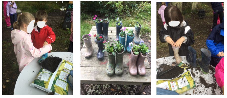 In order to make use of a few of the "many" wellington boots which had been left in school in July (too many for us to store as spares!), Mrs Dear had purchased some bulbs to plant in them. Holes were drilled in the bottom, and then children helped fill them with gravel (for drainage) and compost before planting the bulbs. Mrs Dear explained the difference between seeds and bulbs and why it is important to plant bulbs in the Autumn. The children added some late flowering pansies on the top to help support the last