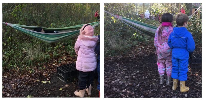 Whilst the children were freely playing and exploring, the majority of children were enjoying the opportunities available for developing gross motor skills. The hammock was enjoyed; climbing the big log tackled, and exploring balance by playing on a plank like a seesaw.