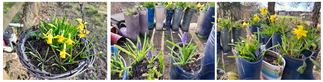 Mrs Dear had also bought tete-tete narcissi bulbs and grape hyacinth bulbs for the children to plant in the hanging baskets and pots. The children who chose to do this discussed the difference between bulbs and seeds, and shared this understanding with the rest of the class at the end of the sessions. This supports their scientific learning about plants and plant lifecycles.