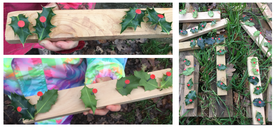 As an extension of their toolwork, Mrs Dear introduced the use of stumpy hammers, discussing how these differed from the mallets used in the previous weeks. The children practised securing holly leaves to wooden batons using nails, first preparing the wood with sandpaper to smooth any rough edges.