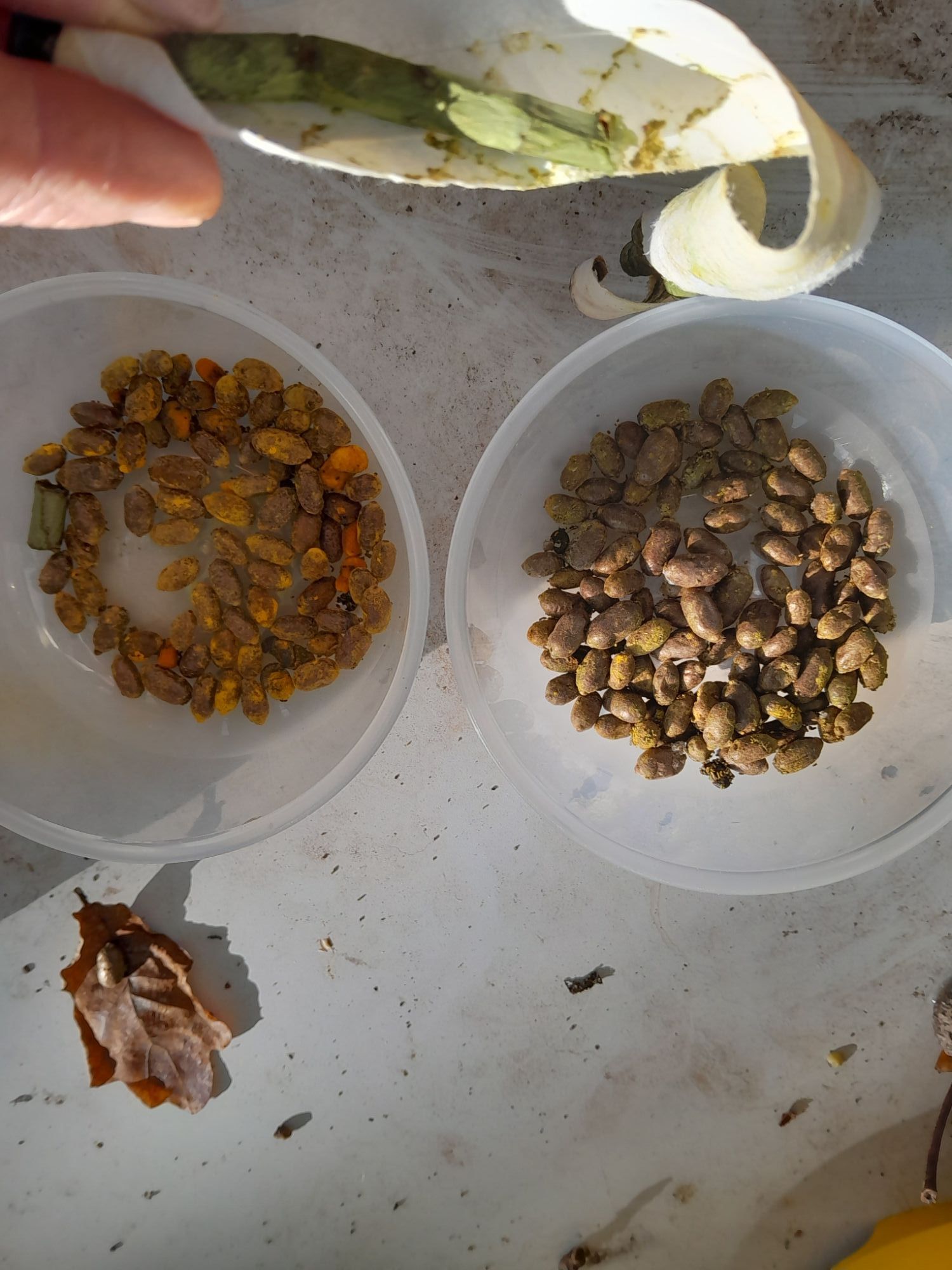 October is the time to harvest the new bee cocoons from the tubes. Mrs Dear carefully unravelled the tubes to reveal the cocoons. You could clearly see the mud and bright yellow pollen which had been foraged and surrounded the cocoons.