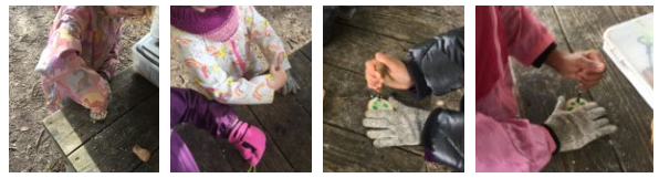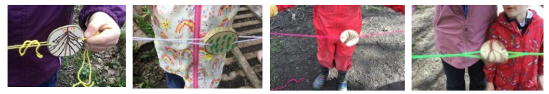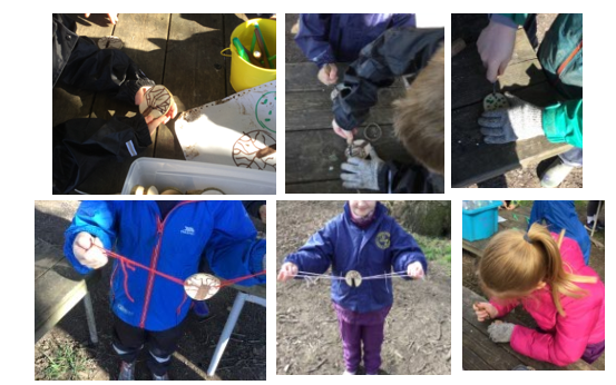 Once on site, and alongside lots of play, Mrs Dear gave the children the opportunity to make a wooden spinner if they wished. The children learnt how to use palm drills, which were a new tool for them, to make two holes in a wooden disc. This required a great deal of strength, determination and perseverance. They also learnt that drills need to be turned clockwise in order to create a hole.