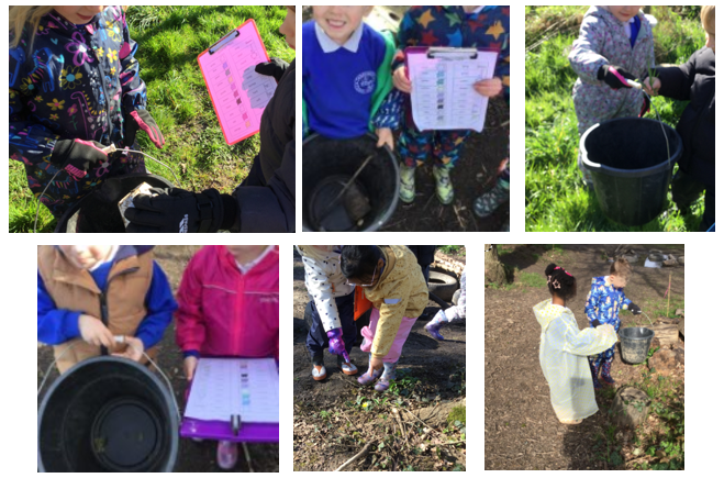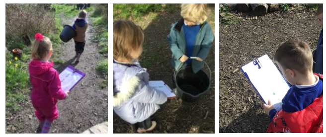Following this, the children worked in pairs to complete a scavenger hunt. Each pair was given a clipboard containing a list of general items to find, such as something soft, yellow, bumpy, round or spiky, along with a bucket to collect their finds. The children thoroughly enjoyed exploring the site, and the adults supported them by helping to identify unfamiliar items, such as lichen, and introducing the rule of "one for me, twenty for nature" to support maintenance of biodiversity.