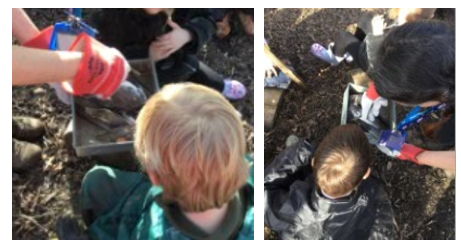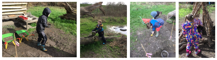 As always, the children relished the opportunity to freely play in the mud and water, using the loose part equipment to transport, create and construct. For badger class on Friday, it was a particularly wet session!