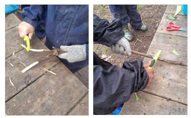 Mrs Dear taught children how to safely use the bow saw to cut a wooden disc. As part of their tool talk, the children learnt to identify the handle, body, sheath, and blade before being guided through the correct motion needed to saw the branch smoothly.