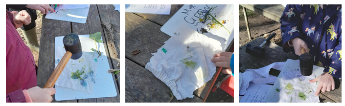 Another activity on offer involved using mallets to bash leaves and flowers to create prints on fabric. The children remembered the rule of “one for me, twenty for nature,” ensuring that they did not pick too many flowers. This activity also helped reinforce their knowledge of the different plants growing around the site.
