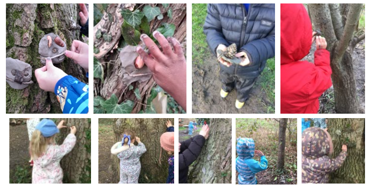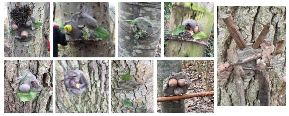 Inspired by the story, the children each made their own clay face for the trees in Beyond the Gate. They used foraged natural materials to create the features and chose an emotion for their face to show, with most children selecting happy expressions. While foraging, Mrs Dear supported the children in identifying items such as acorn cups, moss, lichen and ivy.