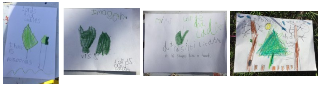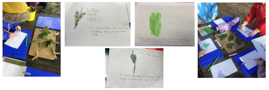 During free play, several children chose to draw the Lords and Ladies leaves and write about them, supporting their scientific learning and the national curriculum objective of identifying plants.