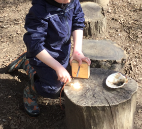 Some children chose to practise their fire‑striking skills, using a fire steel to create a spark and light a piece of cotton wool. This proved challenging for some children, and required determination and perseverance to be successful.