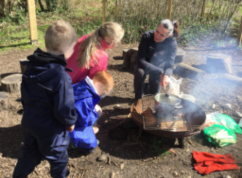 Once the fire was lit, Mrs Dear got busy preparing blackberry crumble. The children observed how the blackberries and oats changed when they were heated over the fire - and the change of state of the butter from solid to liquid. Some children noticed that the blackberries started to bubble, and Mrs Dear explained about the boiling point of liquids.
