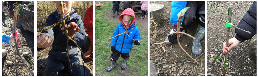 reading The Stick Man by Julia Donaldson. Inspired by the story, some of the children worked with her to create their own members of the Stick Man’s family. They used Y-shaped sticks, carefully whittling away the bark at the top to form faces, before decorating them with wool and foraged natural materials to add clothes and features.